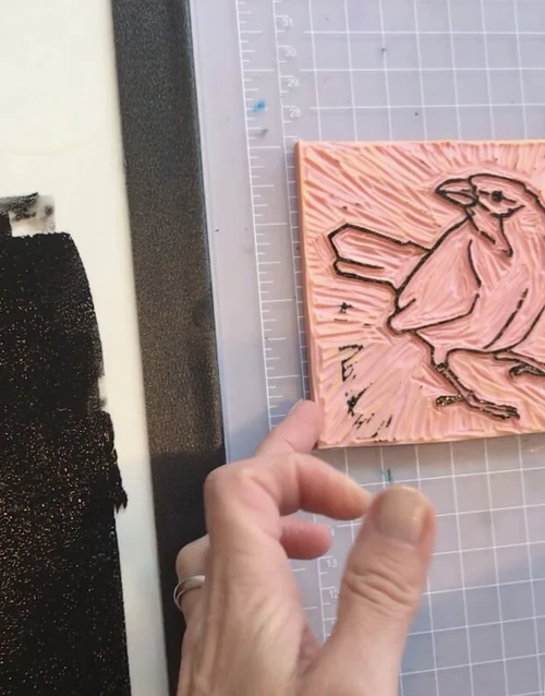 Linocut is a printmaking technique where soft blocks or linoleum is carved into relief design (the reverse of the printed image) and then printmaking ink is applied with a roller (“brayer”) to print the image onto paper. I love how they create a carved wood look.